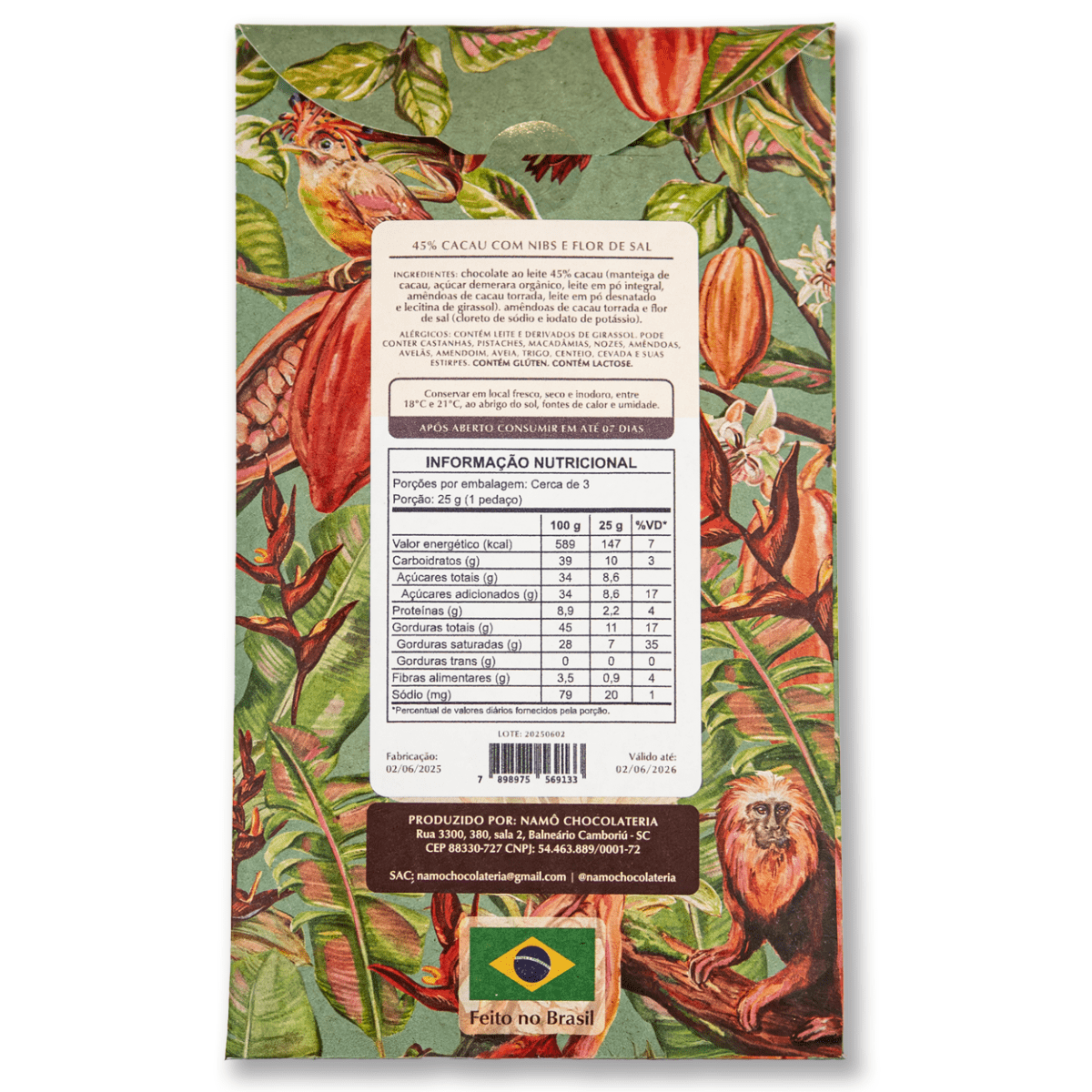 Ingredientes: Base chocolate ao leite 45% (manteiga de cacau, açúcar demerara orgânico, leite em pó integral, amêndoas de cacau torrada, leite em pó desnatado e lecitina de girassol), amêndoas de cacau torrada e flor de sal (cloreto de sódio e iodato de potássio).