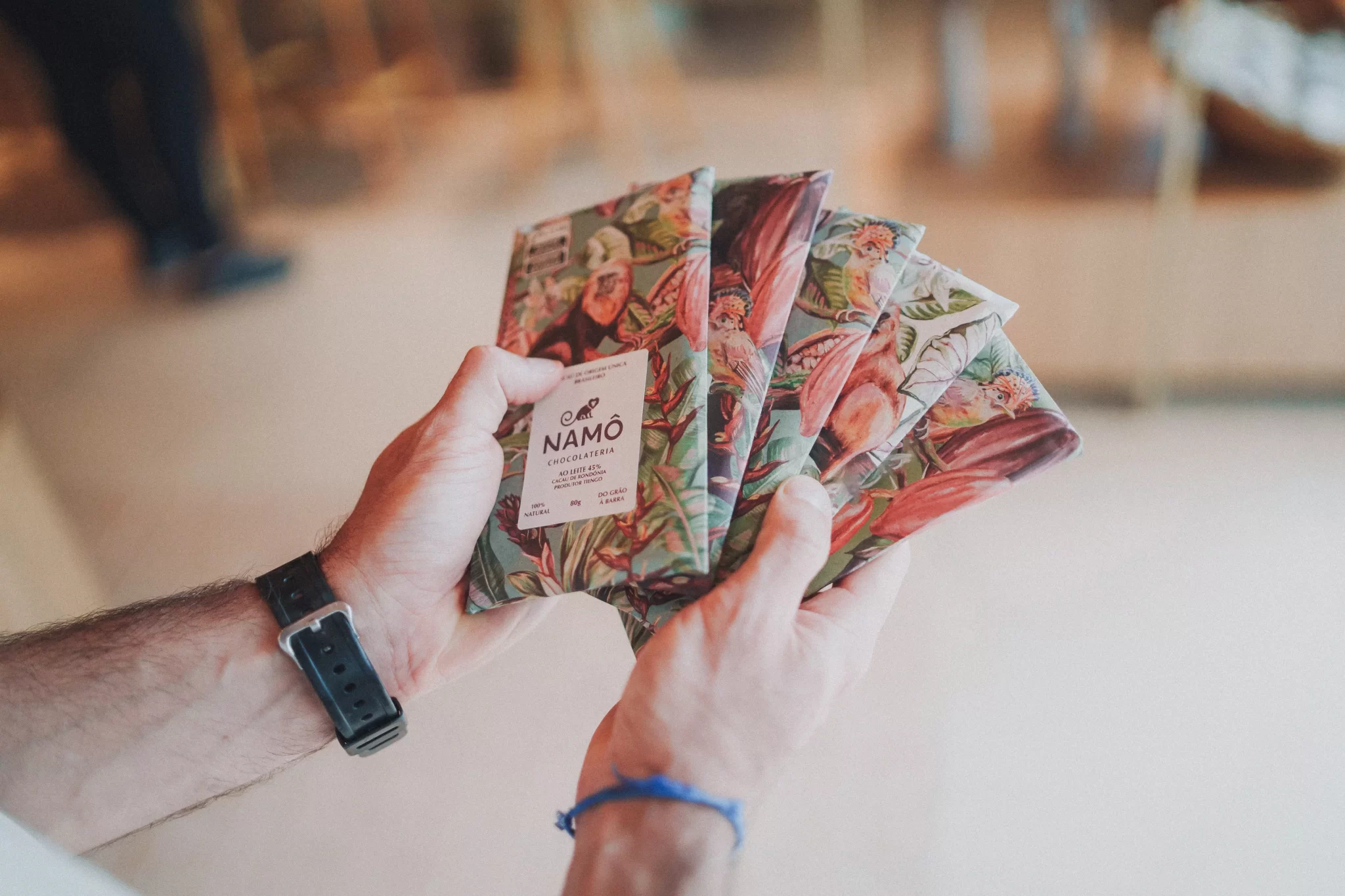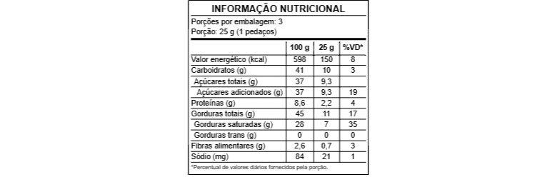 Ingredientes: Açúcar demerara orgânico, manteiga de cacau, leite em pó integral, amêndoas de cacau torrada, leite em pó desnatado e lecitina de girassol.