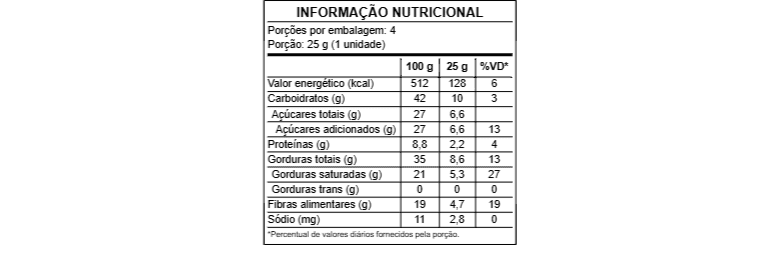 Ingredientes: Base chocolate intenso 70% (amêndoas de cacau torrada, açúcar demerara orgânico, manteiga de cacau e lecitina de girassol), cranberry e flor de sal (cloreto de sódio e iodato de potássio).