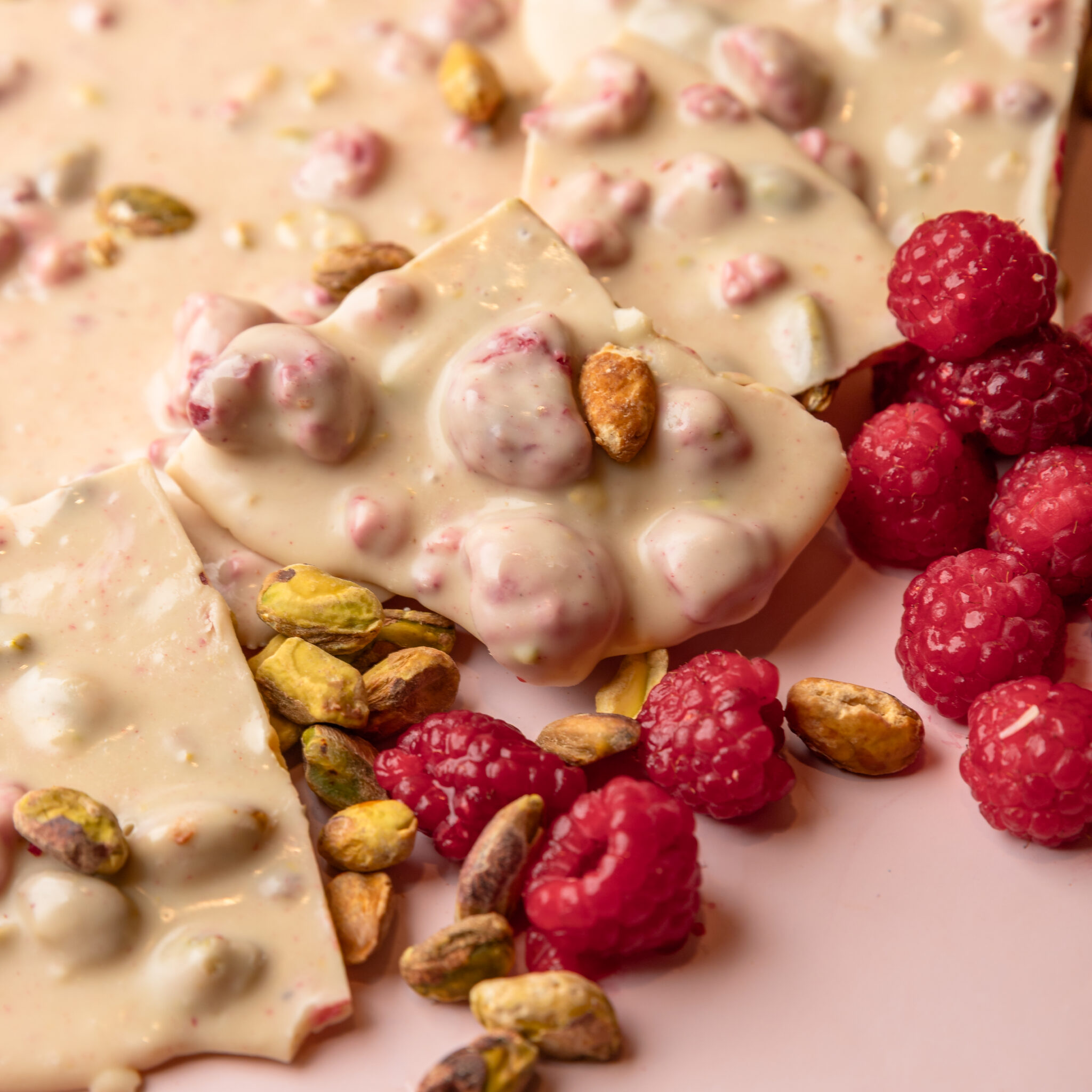 Ingredientes: Base chocolate branco (manteiga de cacau, açúcar demerara orgânico, leite em pó integral, leite em pó desnatado e lecitina de girassol), pistache in natura torrado e sem sal e framboesa liofilizada (framboesa in natura).