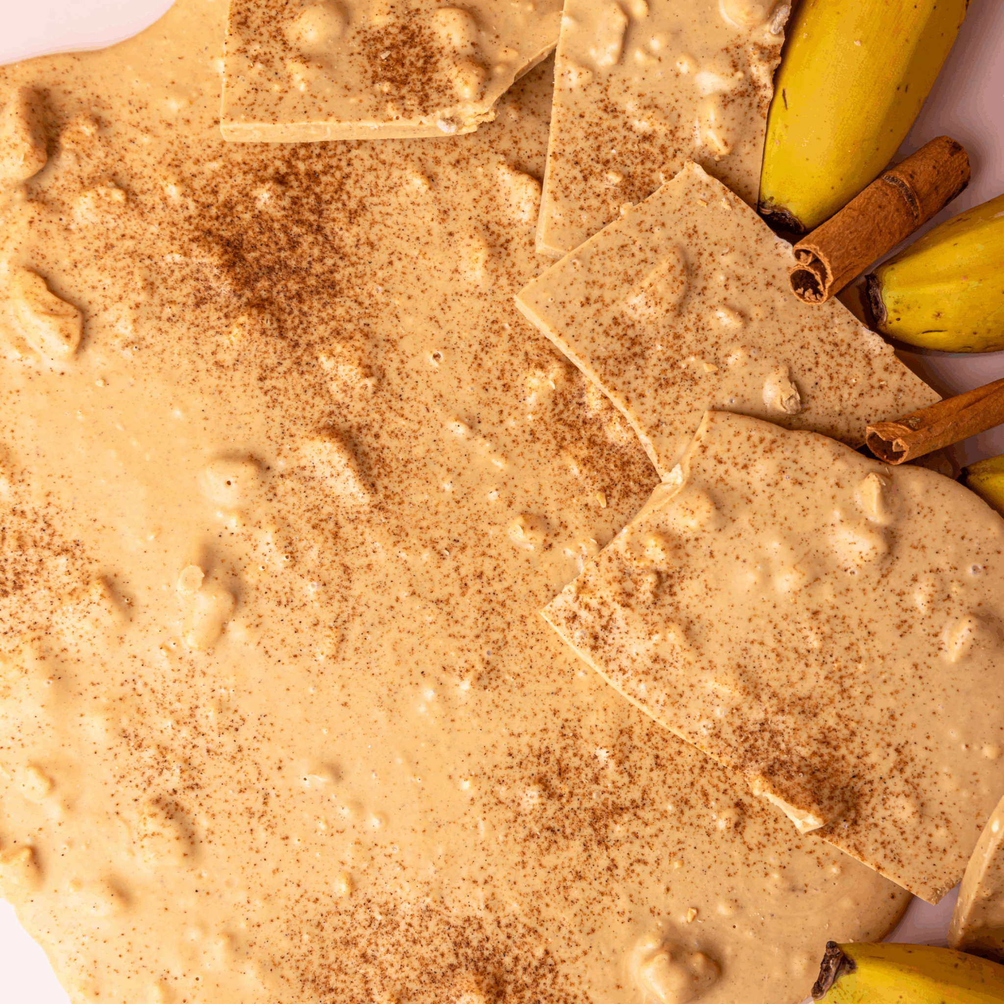 Ingredientes: Base chocolate caramelizado (manteiga de cacau, açúcar demerara orgânico, leite em pó integral, leite em pó desnatado e lecitina de girassol), banana liofilizada (banana in natura liofilizada) e canela em pó pura (canela em pó).