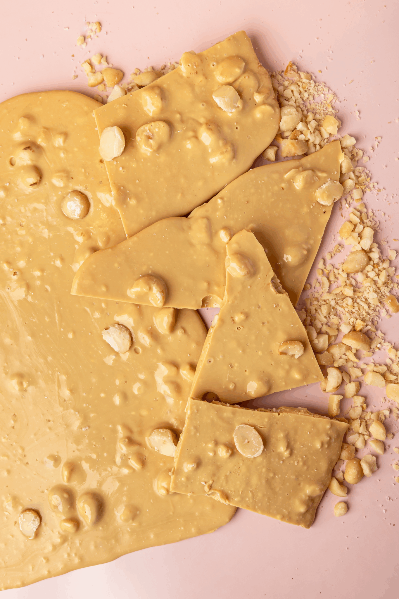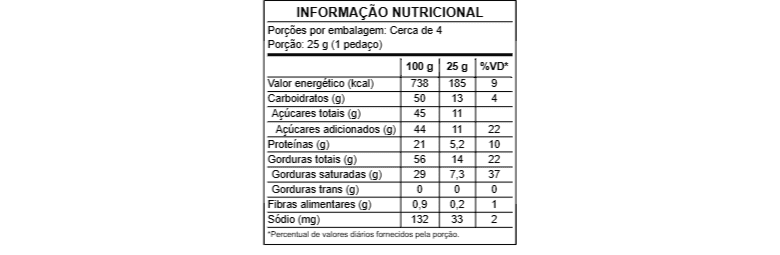Ingredientes: Base chocolate caramelizado (manteiga de cacau, açúcar demerara orgânico, leite em pó integral, leite em pó desnatado e lecitina de girassol), macadâmias e flor de sal (cloreto de sódio e iodato de potássio).